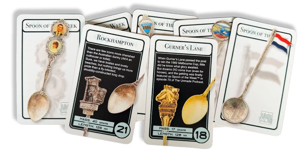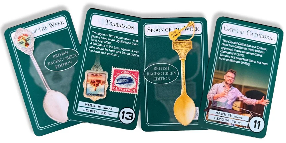 In 2026 we expanded the set to 100 cards. Most are spoons we featured on the show, but other “-oons of the week” are featured, such as moons, prunes and even a baboon. A few other weird and wonderful cards are also out there - but they’re a surprise for now!